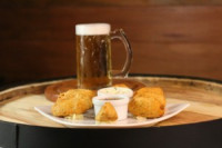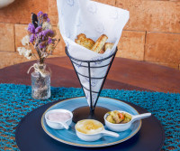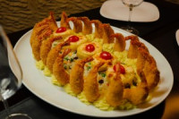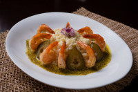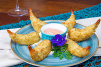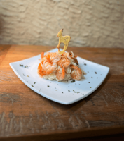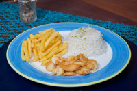 Camarões recheados com requeijão, empanados na farinha Panko. Acompanha: Arroz à Grega e Batata Salteadas com Requeijão.