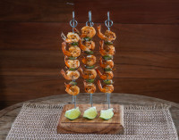Camarões Grelhados, intercalados com pimentão, cebola e tomate à provençal, Pendurados na Forca. Acompanha manteiga de ervas.