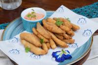 Tiras de peixe empanadas com Farinha de rosca. Uma delicia pra quem ama. Acompanha o molho da casa.