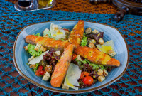 Mix de folhas com palmito caponata de Beringela, tomates secos croutons, parmesão e pesto da casa.