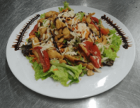 Mix de folhas, com tomates secos, lascas de Parmesão, croutons, cenoura ralada, gergelim tostado e frango grelhado.