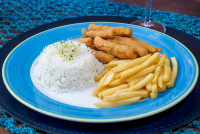 Tiras de Filé de Tilápia empanado na Farinha de rosca. Escolha sua Guarnição: