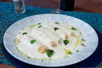 Canelone Feito de massa fresca recheada com Presunto e Queijo. Com 05 unidades.