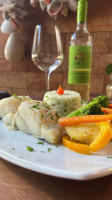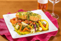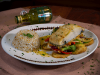 Lombo de Bacalhau assado ao forno sobre legumes e azeitonas pretas salteados na manteiga de ervas. Acompanha: arroz de alho.