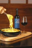 (Penne ao sugo com 06 camarões grandes, tomate cereja, manjericão servido na cesta de queijo.)