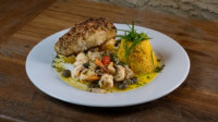 200g de filé de Pescada em posta, na crosta de amendoim com ervas da província, arroz de açafrão com leve toque de leite de coco, acompanhado molho a belle meuniere.