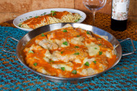 Bacalhau desfiado, puxado no azeite preparado com batata, azeitona preta, cebola e ovos cozidos. Acompanha arroz de brócolis.