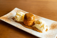 Delicioso bolinho de Milho com calda de doce de leite. Acompanha 1 Bola de sorvete de Tapioca.