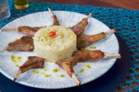 Carré de Cordeiro com Risoto de Queijo coalho, finalizado com Toque de molho Pesto. Com 06 unidades.